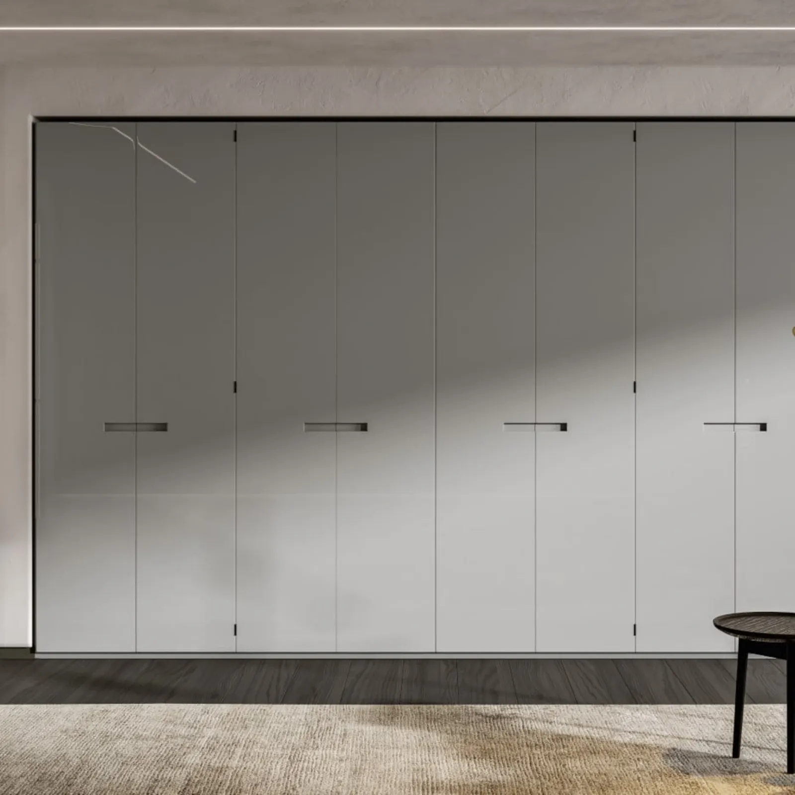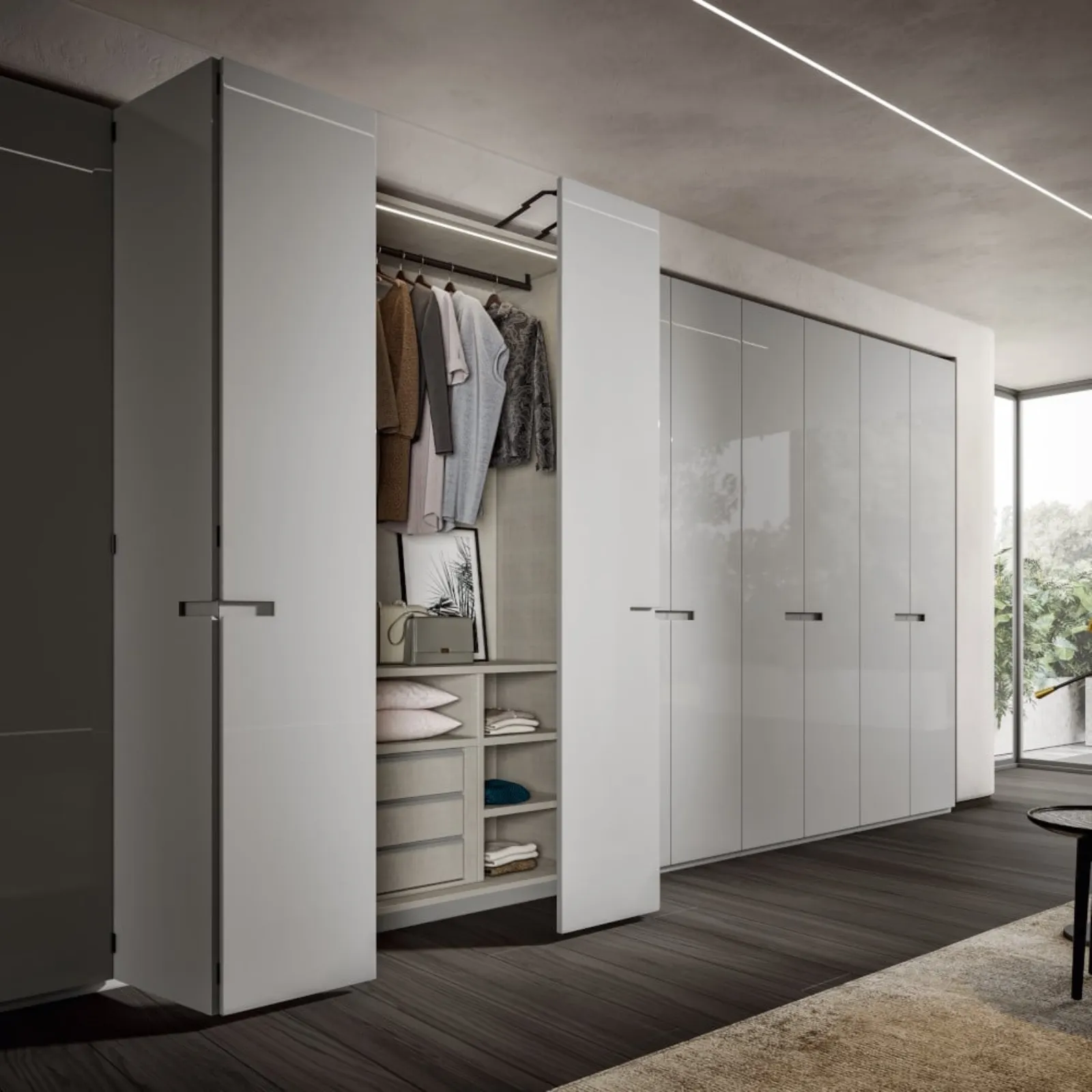 Modello Linea New Laccato Cenere con ante a soffietto in laccato lucido ideale per una zona notte dai richiami moderni: scopri le soluzioni a muro
