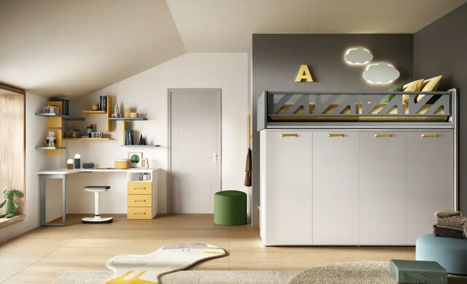 Moretti Compact Camerette asseconda il gusto dei bambini e le esigenze dei genitori con le sue Camerette moderne a soppalco, ideali per esigenze di ogni genere. Con una composizione arredativa Moretti Compact Camerette, potrai ultimare con funzionalità e design lo spazio nel quale i tuoi bambini passano gli anni fondamentali della vita. La Cameretta K109 di Moretti Compact Camerette in melaminico è un ambiente articolato da organizzare attentamente, mixando vari elementi accessori su misura. Cromie di tendenza e soluzioni progettuali d'eccellenza caratterizzano le più belle proposte del rinomato marchio che proponiamo nel nostro punto vendita.