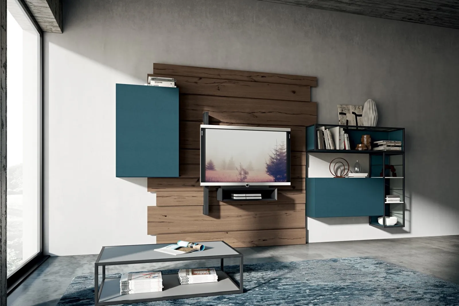 Parete Attrezzata Rebel R 03 di Fimar: scopri una delle più originali soluzioni in laccato opaco per arredare il living con noi