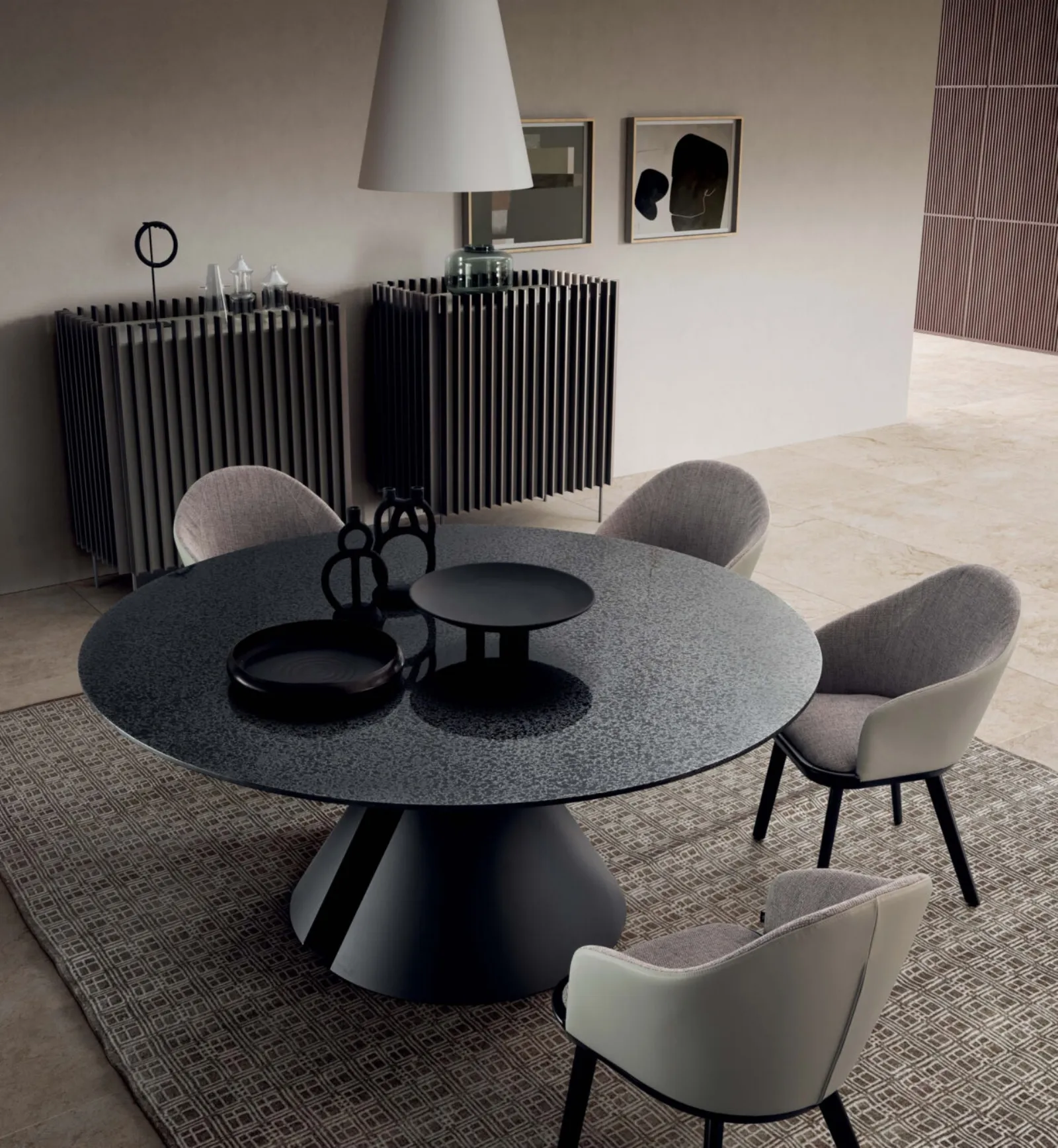 Un modello come quello nell'immagine, in abbinamento alle giuste sedie, saprà valorizzare il look delle stanze di casa dedicate per eccellenza all'ospitalità. Il noto e conosciuto brand Presotto, specialista nella realizzazione di arredi in ceramica, ha scelto per la sua serie un'infinità di materiali, linee e tonalità. Ideali per dare vita a degli accostamenti unici con sedie e complementi design, i Tavoli fissi del marchio sono soluzioni tra le più originali in commercio, ideali per il living e la cucina. Se vuoi un tavolo da pranzo di elevata qualità, contattaci e ricevi informazioni e preventivi sul modello mostrato in foto. Tavolo rotondo Nimbo di Presotto: realizzato in materiali durevoli è caratterizzato dalle linee decise del top e da un basamento ricercato ed elegante.
